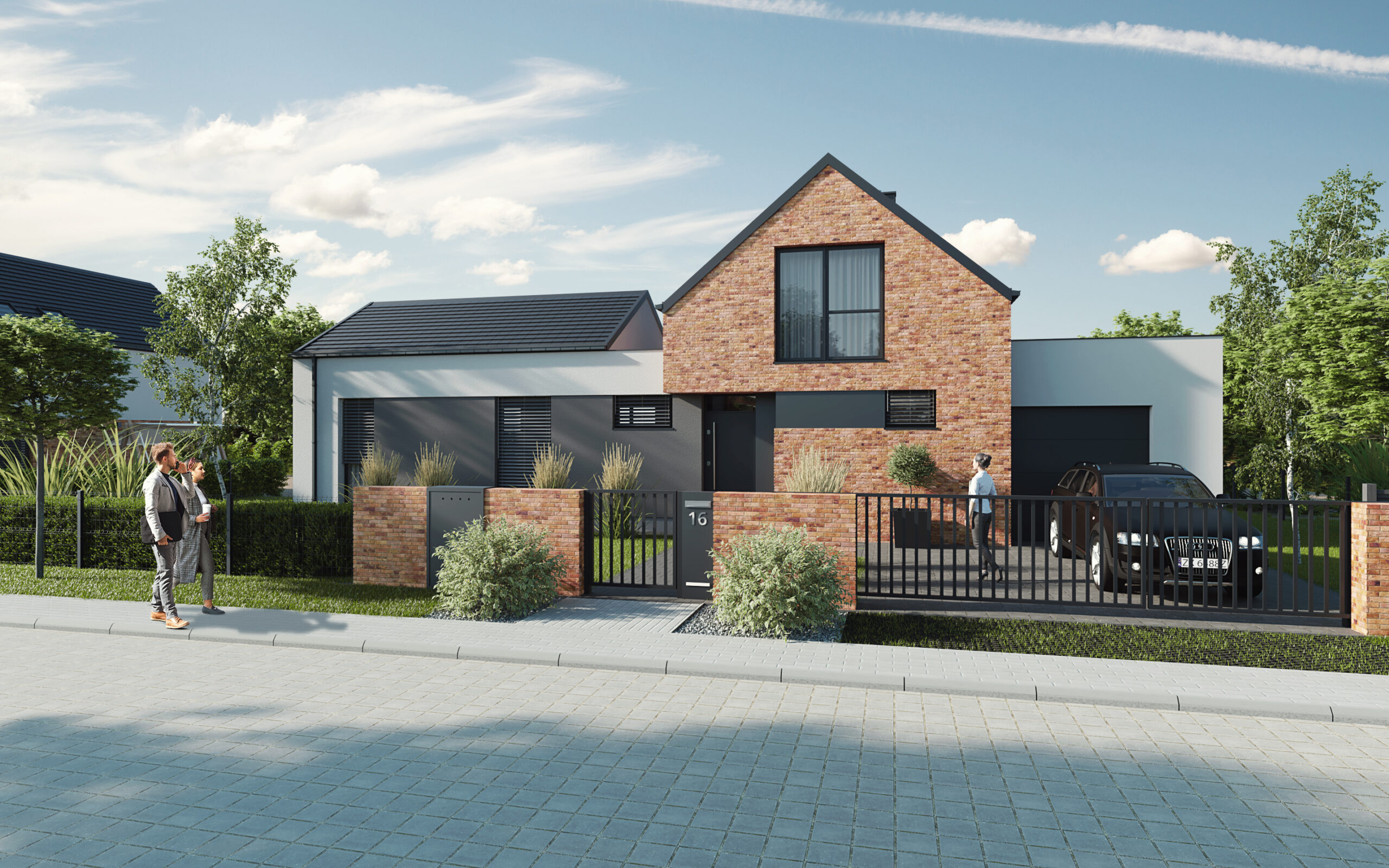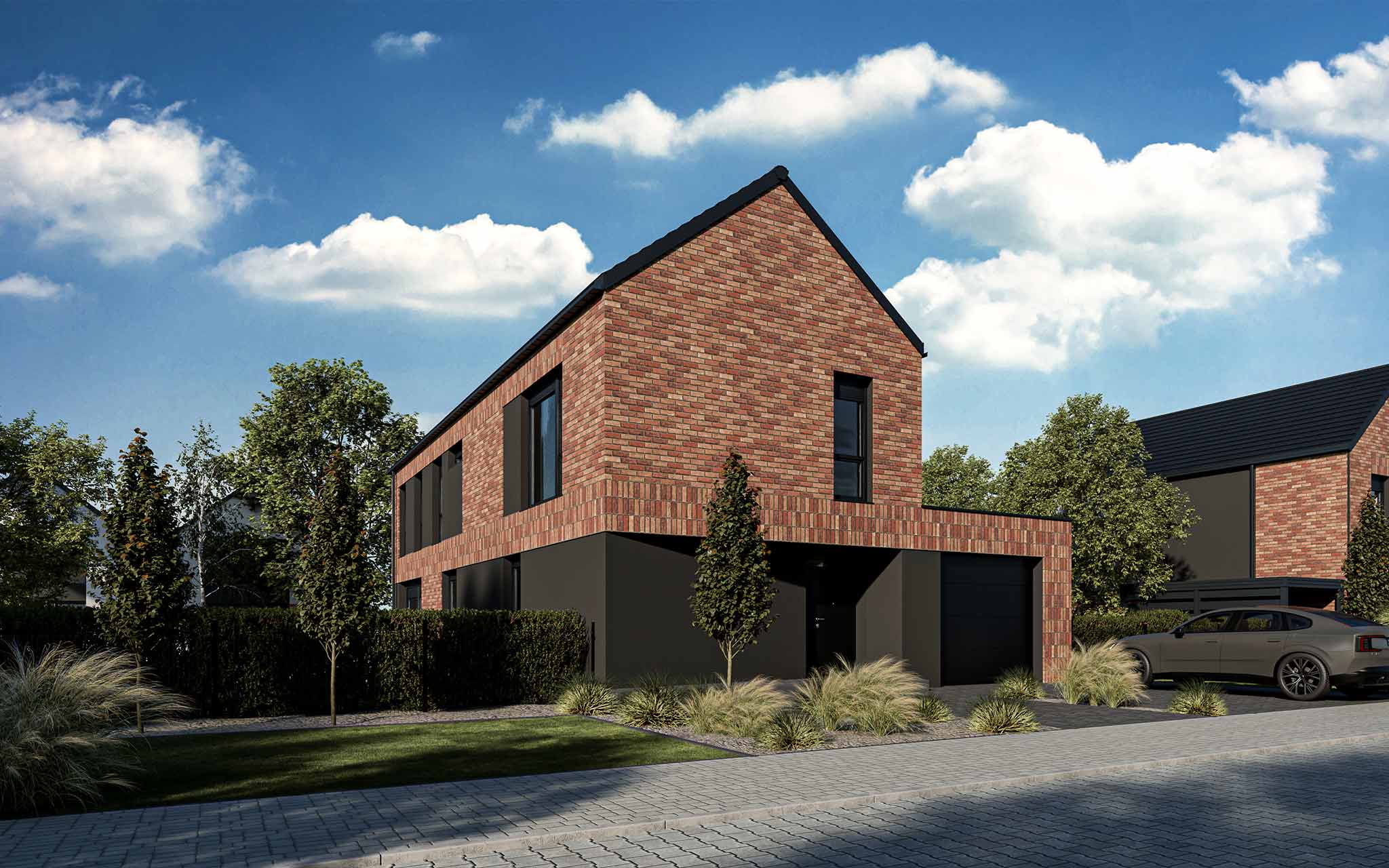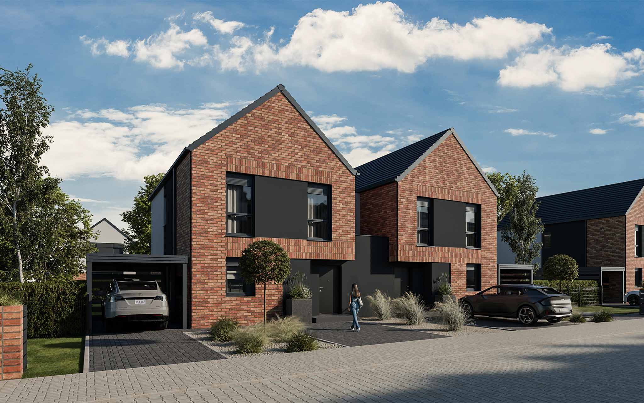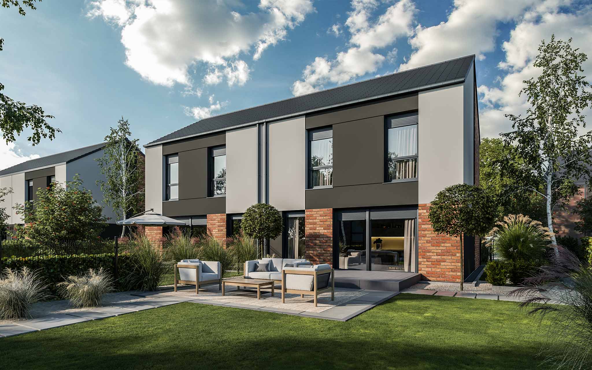 Nowoczesna bryła domu łączy białe i szare tynki z akcentami cegły. Możliwość wyboru układów domu pozwala na pełne dostosowanie go do oczekiwań mieszkańców. Przestronne pokoje umożliwiają swobodę w ich urządzaniu i pełną funkcjonalność. Taras i duży ogród gwarantuje odpoczynek na świeżym powietrzu. Dzięki wydzielonym miejscom postojowym, nie ma problemu z parkowaniem.